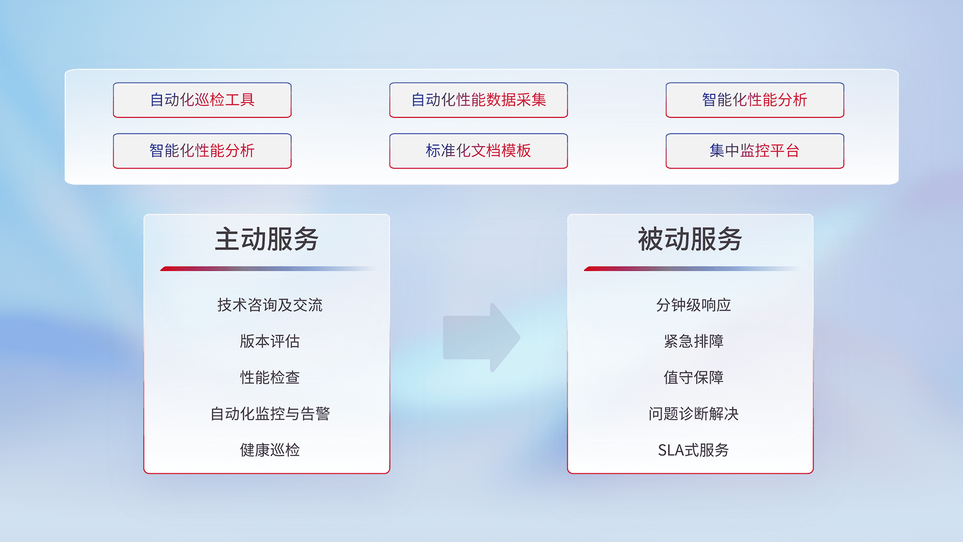 智能化工具和标准化文档,,保障服务质量,,,,提供主动服务(包含技术咨询、、、版本评估、、、、性能检查、、、、自动化监控与告警、、健康巡检)和被动服务包含(分钟级响应、、、紧急排障、、、值守保障、、、问题诊断解决、、、、SLA服务)。。。。
