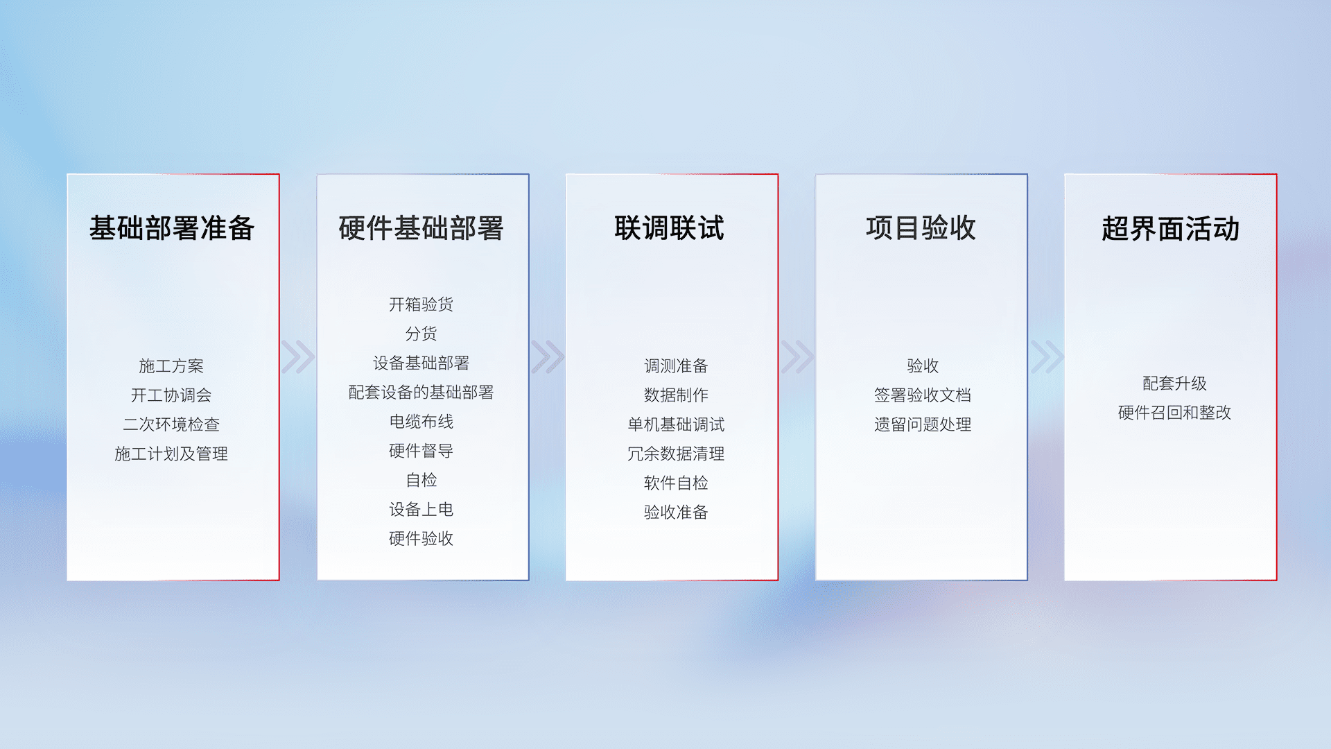 从基础部署准备、、、、硬件基础部署、、联调联试、、、、项目验收、、、、越界面活动的全过程可追溯,,,,保证施工质量和进度。。